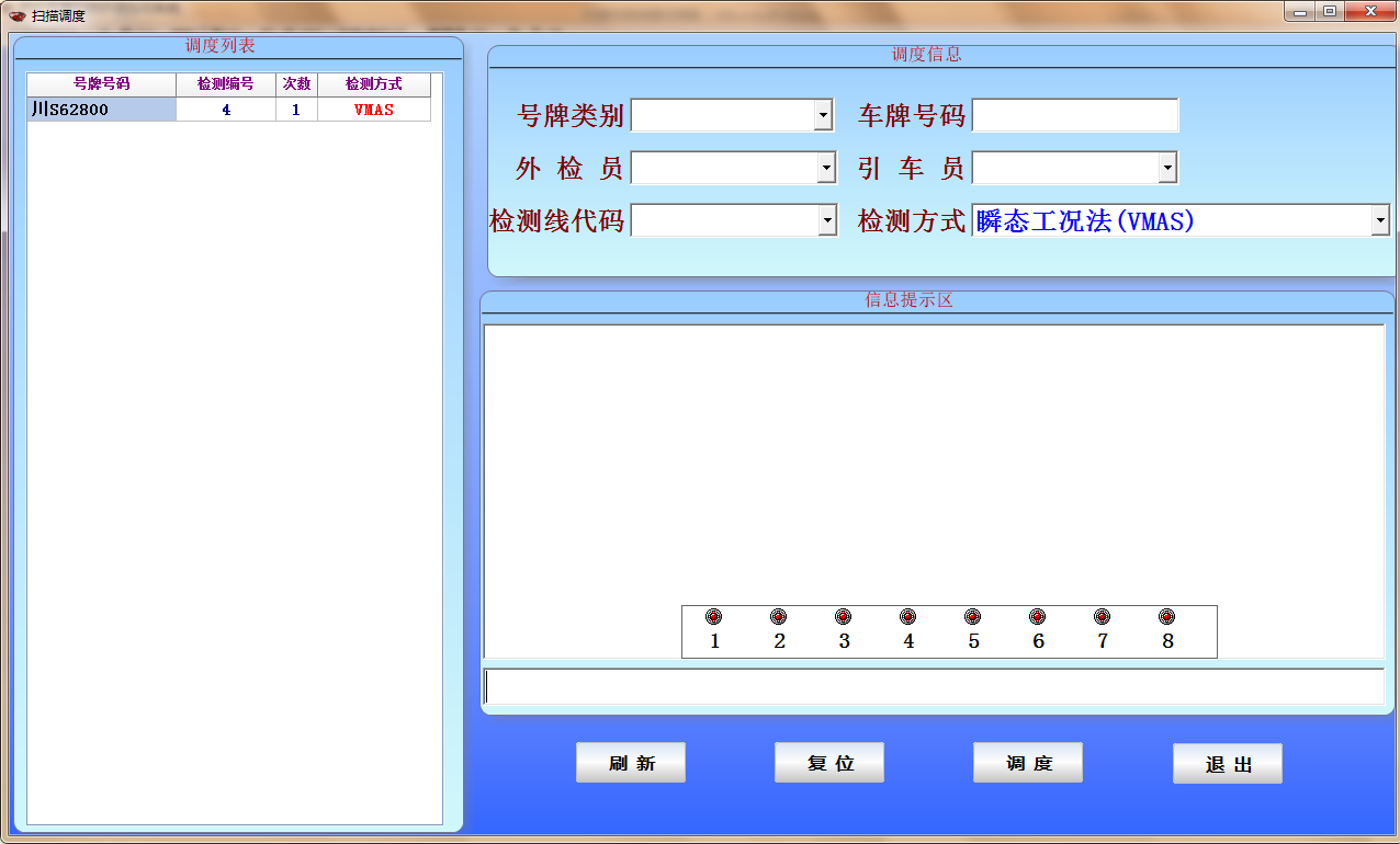 扫描调度:每辆待检机动车配备有一个唯一性条码,通过扫描该条码获取车辆信息,每个引车员扫描分配给自己的条码,然后选择检测方式,扫描检测线条码,发送至该检测线待检。